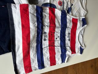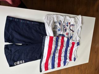 Conjunto de ropa para niño de la marca Mayoral, talla 6. Incluye dos camisetas y un pantalón. - Camiseta blanca con estampado de patinetas y detalles en rojo y azul. - Camiseta de tirantes a rayas rojas, blancas y azules con estampado de patinetas. - Pantalón corto azul marino con detalles de rayas en la cintura y el número 1980 en la pierna.