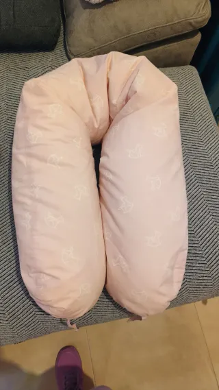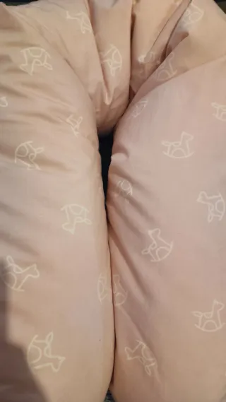 Cojín de lactancia en color rosa con un dulce estampado de caballitos de madera. - Funda extraíble y lavable. - Diseño ergonómico para mayor comodidad.
