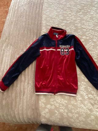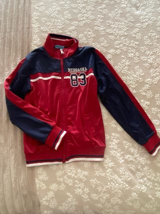 Chaqueta deportiva para niño de 12 años. - Diseño bicolor en rojo y azul marino. - Detalle de NEBRASKA 83 bordado en el pecho. - Cuello alto y cierre de cremallera. - Puños y bajo con banda elástica. - La chaqueta está prácticamente nueva, se puede comprobar en los puños