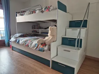 Cama litera de 90cm con espacio de almacenamiento, con algún desperfecto en pintura, se adjunta foto - Estructura de madera y metal. - Escalera lateral con cajones - Cajones integrados en la base. - Incluye un colchón
