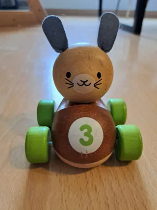 Coche de madera con diseño de conejo, perfecto para los más pequeños. Sus ruedas verdes y el número 3 en su lateral le dan un toque divertido. - Fabricado en madera. - Diseño de conejo. - Ruedas de color verde. - Detalle de número 3.