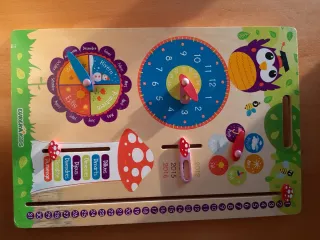 Panel educativo de madera para aprender el calendario y el tiempo. Incluye elementos interactivos para el día, mes, estación y clima. - Diseño colorido con ilustraciones de animales y naturaleza. - Fabricado en madera. - Marca: EUREKA KIDS.