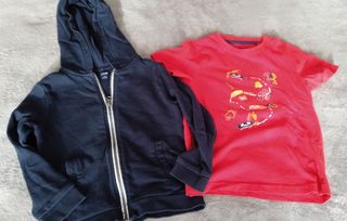 Lote de ropa para niño o niña de 4 a 5 años. - Sudadera azul marino con cremallera. - Camiseta roja con estampado de coches. - Camiseta azul marino con estampado de PJ Masks. - Pantalón azul marino. - Camisa de manga larga a rayas verdes y blancas. - Camisa de manga larga blanca con cuello mao.