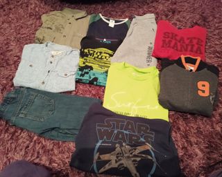 Lote de ropa para niño de 6 a 8 años. - Camisa de manga larga a rayas azules. - Camiseta verde lima con estampado Surfer. - Sudadera gris con cremallera y número 9. - Sudadera roja con estampado Skate Mania. - Pantalón de chándal gris con texto Winner. - Camiseta azul marino con estampado Star Wars. - Camiseta negra con estampado gráfico. - Pantalón vaquero azul.