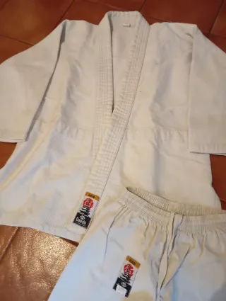Traje de judo blanco, compuesto por chaqueta y pantalón. - Chaqueta con cuello reforzado. - Pantalón con cintura elástica y cordón. - Parche de la marca en chaqueta y pantalón. -talla 130cm