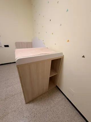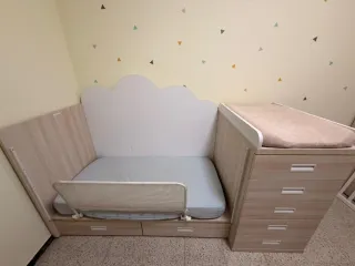 Mueble infantil versátil que incluye cuna, cambiador y almacenamiento. Llit: Alçada llit (sense matalàs): 23cm Fins al capçal: 100cm Llargada llit: 145cm Amplada: 80cm Cambiador: Alçada: 91cm Amplada: 54cm Profunditat: 80cm Llaragada total llit+cambiador: 200cm - Cuna con diseño de nube. - Cambiador integrado. - Dos cajones amplios. - Compartimento de almacenaje adicional.
