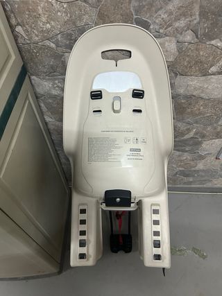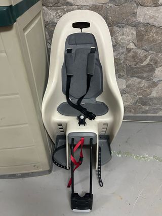 Portabebés para bicicleta en color blanco y gris. Cuenta con cinturón de seguridad y reposapiés. - Diseño ergonómico. - Acolchado interior. - Sistema de sujeción. - Reposapiés ajustables.