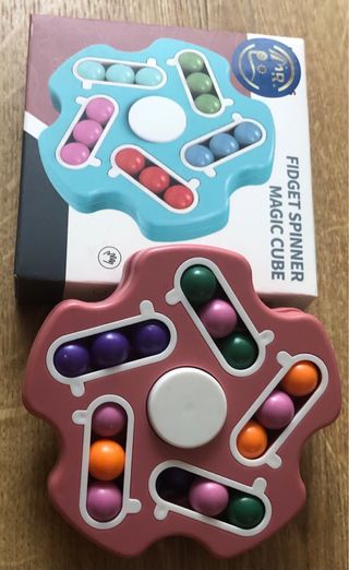 Juguete giratorio con cuentas de colores para ejercitar la mente. - Diseño en forma de flor. - Incluye cuentas de colores variados. - Mecanismo giratorio central.