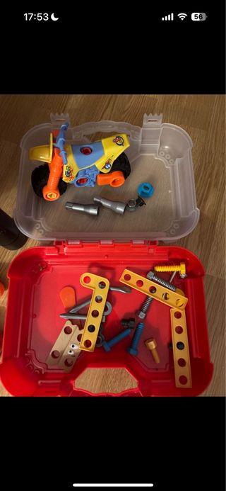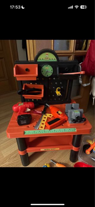 Banco de trabajo de juguete para niños, ideal para fomentar la creatividad y el juego. - Incluye varias herramientas de plástico como taladro, sierra y tornillos. - Diseño colorido con compartimentos para guardar las piezas. - Reloj decorativo en la parte superior.