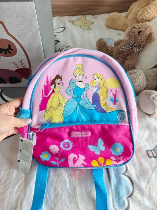 Mochila infantil con diseño de princesas Disney. - Personajes: Cenicienta, Bella y Rapunzel. - Colores: rosa y azul. - Estampado de flores y mariposas en el bolsillo frontal. - Cierre de cremallera.