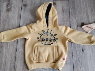 Conjunto de dos prendas de Levi's para niño/a. En buen estado. Se venden de forma conjunta - Sudadera amarilla con capucha y bolsillo frontal. - Camiseta de manga larga en color melocotón. - Estampado gráfico de la marca en ambas prendas.