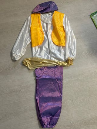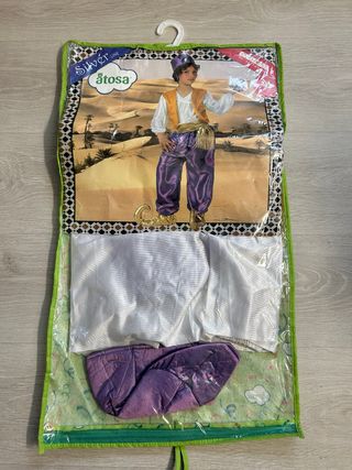 Disfraz de sultán para niño, talla 7-9 años. Se encuentra en perfecto estado. - Incluye pantalón, chaleco, camisa y cinturón. - Tejido brillante en color morado y dorado.