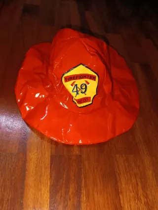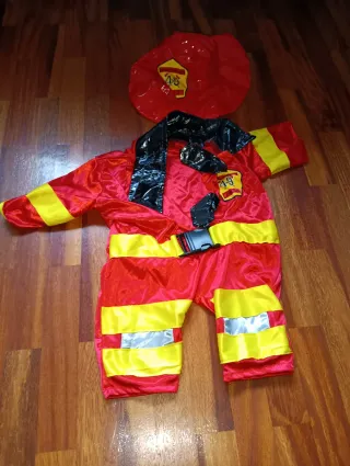 Disfraz de bombero para bebé, ideal para fiestas o juegos. - Traje rojo con detalles amarillos y plateados. - Incluye gorro a juego.