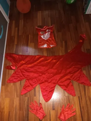Disfraz de dragón para bebé, ideal para fiestas o eventos. - Color verde con detalles en rojo. - Capucha con adornos. - Alas rojas en los laterales. - Diseño con escamas. - 42cms desde el cuello hasta el tiro y 42cms de ancho - Usado una vez