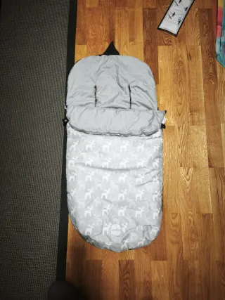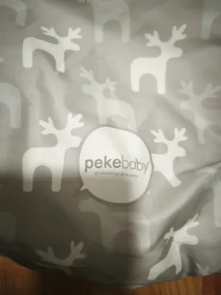Saco de invierno de la marca PEKEBABY, diseñado para carritos de bebé. Presenta un estampado de renos en tonos grises y blancos. No se ha utilizado a penas, pero a la hora de lavarlo se ha rasgado en una de las aperturas para meter el arnés. De ahí el precio. - Estampado de renos blancos sobre fondo gris. - Diseño acolchado para mayor comodidad. - Aberturas para el arnés del cochecito.