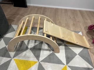 Conjunto de arco y rampa de madera para el desarrollo de la psicomotricidad, inspirado en el método Montessori. - Material de madera natural. - Diseño curvo y superficie inclinada.