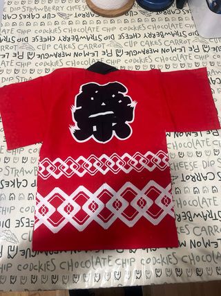 Parte superior de un disfraz de Karate Kid para niño. Es de color rojo con detalles en negro y blanco. - Diseño inspirado en el traje de karate. - Mangas cortas. - Cuello negro con inscripciones.
