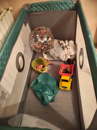 Parque infantil de viaje, fácil de montar y desmontar. Ideal para que los más pequeños jueguen y descansen de forma segura. - Diseño moderno en gris y verde. - Laterales de malla transpirable. - Puerta con cremallera para acceso. - Ruedas para facilitar el desplazamiento. Medidas de largo 1'25 y 0'65 de ancho