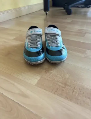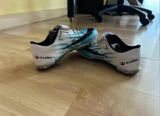 Zapatillas de fútbol con un diseño moderno y llamativo. Talla 33. - Color blanco con detalles en turquesa. - Cierre de velcro. - Marca S-LieNiao.