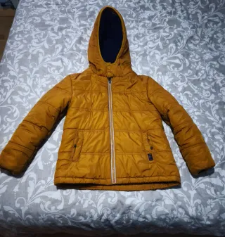 Abrigo acolchado de color mostaza para niño de la marca Orchestra. Con capucha y cierre de cremallera. Talla 8-10 años. - Capucha forrada. - Bolsillos laterales con botón. - Puños elásticos.