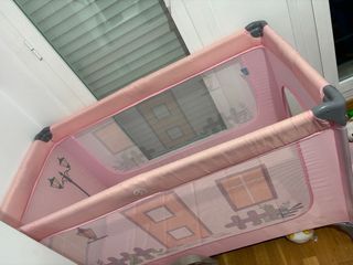 Cuna de viaje modelo Home, con un diseño infantil y divertido. - Dimensiones: 125 x 77 x 65 x 45 x 110 cm. - Color rosa con estampado a cuadros.