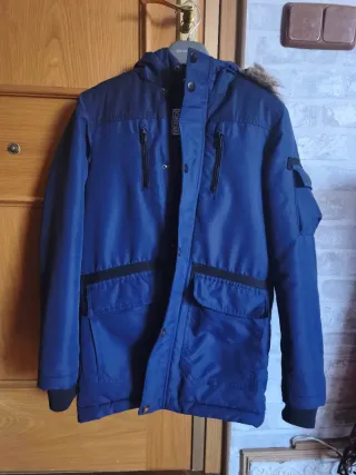 Abrigo azul marino para niño, ideal para el frío. Talla 8-10 años. - Capucha con pelo sintético. - Cierre de cremallera y botones. - Bolsillos frontales.