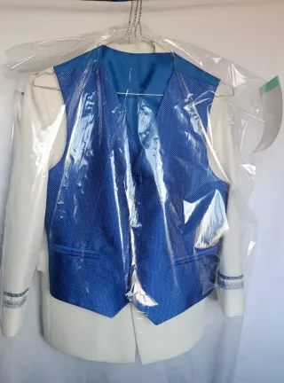 Se vende traje de primera comunión con estilo de capitán en combinación de blanco y azul, con un diseño muy elegante y atemporal que sienta muy bien. Tiene talla 13, de niños de 145-155 cm aprox Cuenta con un estado imperial recién salido de la tintorería con su funda protectora y sin una sola arruga Hay fotos de el traje en la funda y fotos de como quedara ya puesto