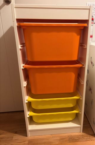 Mueble infantil IKEA TROFAST en perfecto estado. Ideal para organizar juguetes y materiales de manualidades. - Estructura blanca. - Dos cubos naranjas. - Dos cubos amarillos.