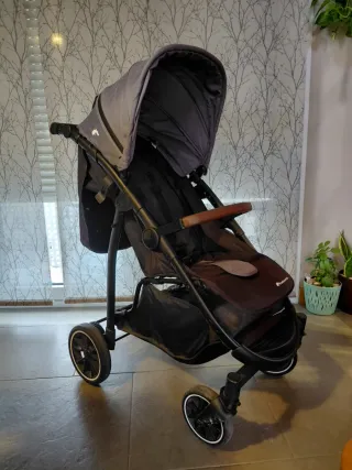 Carro de paseo Bebeconfort para bebé en color gris y negro con detalles en cuero marron. Muy facil de plegar. Medidas plegada aprox: 87 x 57 x 30 Muy poco uso, buen estado. - Capota ampliable. - Asiento reclinable. - Cesta de almacenamiento inferior. - Muy facil y rapido de pleglar y abrir NO NEGOCIABLE