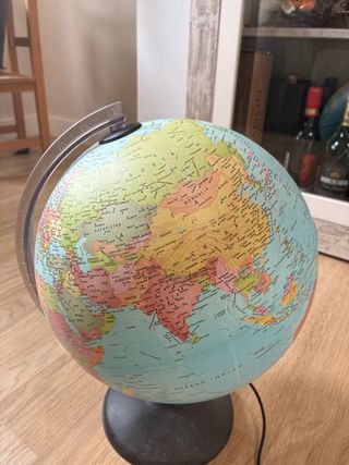 Globo terráqueo en excelente estado, listo para decorar tu espacio. - Mapa político detallado de Europa, África y Atlántico. - Base negra robusta. - Incluye cable de alimentación.