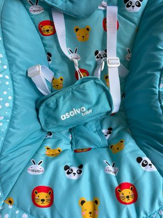 Silla balancín para bebés de la marca Asalvo, con un diseño alegre y colorido. - Tapicería azul con estampado de animales y lunares blancos. - Barra de juegos con figuras. - Arnés de seguridad.