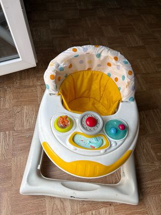 Silla para aprender a andar. Tiene música y funciona perfectamente. Le faltan 3 ganchos pero sujeta igualmente.