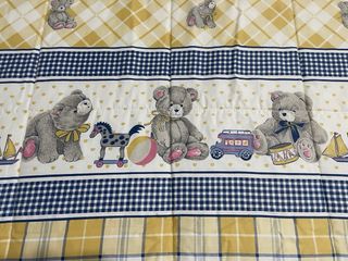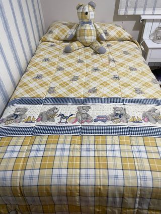 Monísimo Edredón infantil tipo manta para cama de 90 cm con un divertido diseño de ositos y cuadros amarillos y blancos con una bonita cenefa a los pies. - Diseño reversible con la otra cara en cuadros tipo Vicky. - Las esquinas se ajustan con lazada. - Marca ArteMur. Medidas: 180 de ancho x 255 de largo De regalo envio: - Osito de adorno al tono. - Volante para cortinas o cabecero de ventana a tablas y con cinta para ganchos de colgar (48 cm de largo x 176 de ancho) - Tela para confeccionar cogines o tapizar silla o utilizar en decoración. Tiene un pequeño roce rojizo que apenas se nota y reseño en la última foto.