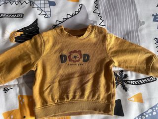 Sudadera amarilla de manga larga para bebé de la marca Kiabi. - Diseño con estampado de león y texto Dad I love you. - Cuello redondo y puños elásticos. -Talla 6 meses 68 cm 8 kg