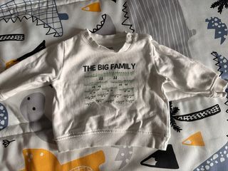 Sudadera blanca de manga larga para bebé de la marca Kiabi. Presenta un divertido estampado de cocodrilos y el texto THE BIG FAMILY. - Talla 6 meses. 68 cm. 8 kg - Cuello redondo. - Cierre de botones a presión en el hombro. -usado muy pocas veces, le quedo pequeño muy rapido