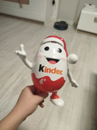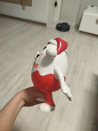 Hucha con forma de muñeco de la marca Kinder. - Fabricada en plástico. - Diseño festivo con gorro de Papá Noel.