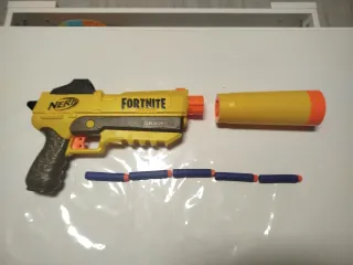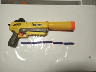 Pistola de juguete Nerf inspirada en Fortnite, con silenciador y cinco balas. - Diseño amarillo y gris. - Incluye silenciador. - Viene con 5 balas de espuma.