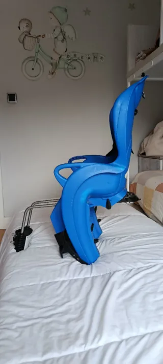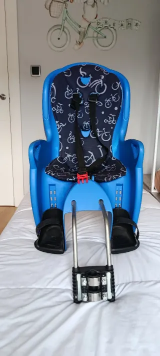 Silla de seguridad para bicicleta, diseñada para transportar a bebés de forma segura. - Color azul vibrante. - Acolchado interior con estampado de bicicletas. - Arnés de seguridad de 3 puntos. - Reposapiés ajustables.