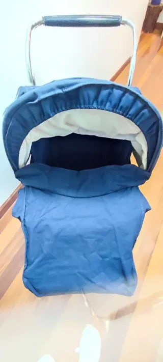 Cochecito de juguete para muñecas, ideal para que los más pequeños jueguen a ser papás. - Estructura de metal azul. - Capazo acolchado con estampado de ovejas y rayas. - Ruedas blancas. - Pequeña cesta almacenaje Sirve como capazo y como silla ya que se puede poner recto para el capazo y doblarse para hacerse silla. El manillar se regula a la altura del niño y para guardar, como se puede ver en las fotos. Bolso a juego. Para llevarlo mejor le pusimos los adaptadores que llevababa en el carro de mi bebe. El cojín que sale en la foto no sé vende