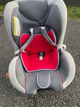 Silla de coche para niños, diseñada para ofrecer seguridad y comodidad. - Tapicería gris y roja. - Arnés de seguridad de 5 puntos. - Incluye etiqueta de advertencia.