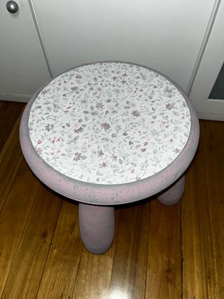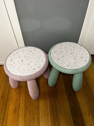 Taburetes con diseño único, esta pintado a mano Conjunto de dos taburetes infantiles con un bonito diseño floral. - Un taburete es de color rosa y el otro es verde menta. - Asiento redondo con estampado floral. - Patas estables y redondeadas.