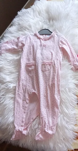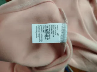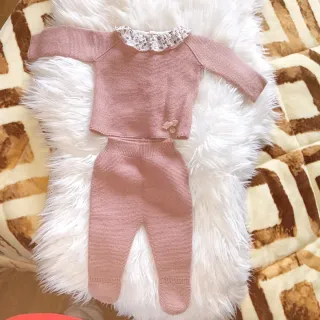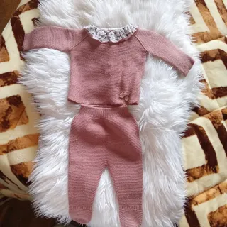 Conjunto de dos piezas para niña en color rosa. - Tejido de punto. - Cuello con volante estampado. - Detalle de lazo y botón en la parte delantera. - Pantalón largo con pie. He compró de una tienda por 35€.