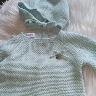 Conjunto de tres piezas de punto para bebé, ideal para los más pequeños. El conjunto de la marca juliana incluye un jersey con gorrito y un pantalon. Talla 3 meses. - Color verde agua. - Tejido suave y confortable. - Detalle de lazo en el jersey.