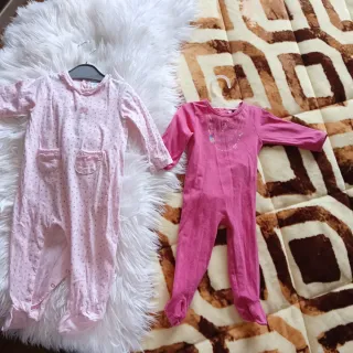 Conjunto de dos peleles para niña en color rosa,talla 6 meses. - Uno con estampado de topitos y bolsillos. - Otro liso con dibujo en el pecho.