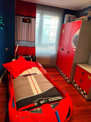 Dormitorio juvenil con temática de coche de carreras. - Cama con diseño deportivo en color rojo. - Ropa de cama con motivos de competición. - Armario y cómoda a juego. - Cortinas con diseño de semáforo y bandera a cuadros.