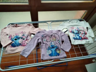 Conjunto de 3 camisetas de manga larga y 1 sudadera con capucha, todo con estampado de Stich. Sin etiqueta pero sin usar. A estrenar, nueva. Talla 90cm, unos 2 años. Más ropa, juegos, libros... Visita mi perfil y pregunta sin compromiso.