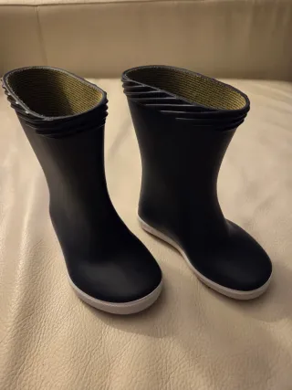 Botas de agua de color negro, perfectas para días lluviosos. Tienen un diseño moderno y son cómodas. Talla 21/22 - Material exterior de goma. - Forro interior de tela. - Suela de goma antideslizante.