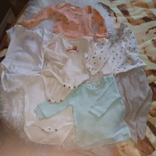 Conjunto de varias prendas de ropa para bebé niña. Talla 3 meses. - Mono amarillo con dibujo de conejo. - conjunto blanco sudadera y pantalón con estampado de Hello Kitty. - Mono gris con dibujo de gatita. - Pelele rosa de punto. - Body blanco con dibujo de Mickey Mouse. - Body azul marino.
