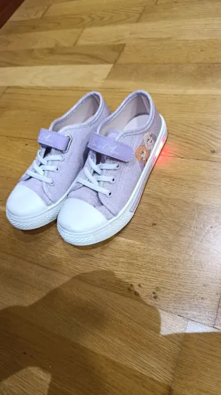 Bonitas zapatillas para niña con diseño de Frozen, talla 30. Perfectas para el día a día. - Brillantes y con detalles de purpurina. - Cierre de velcro y cordones. - Ilustraciones de Elsa y Anna. - Suela con luces LED que se activan al caminar.