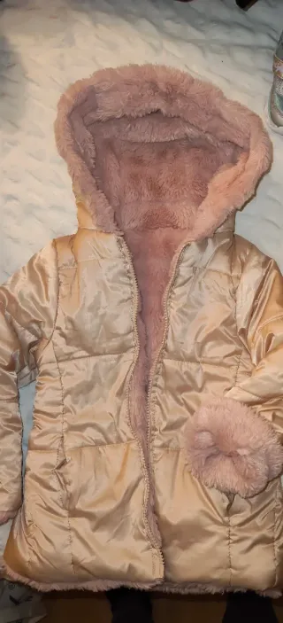 Chamarra reversible para niña boboli, con un lado satinado en color dorado y el otro forrado de peluche rosa. - Capucha con forro de peluche. - Puños con detalle de peluche. - Cierre frontal.
